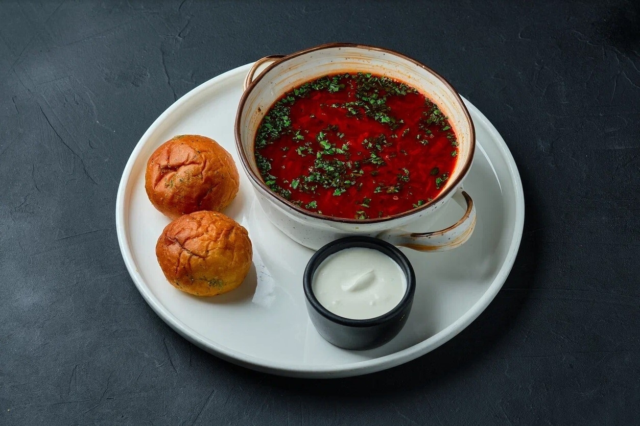 Классический борщ с говядиной. Подается со сметаной и чесночными пампушками.