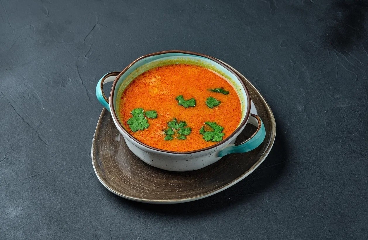 Самый популярный тайский суп с рисом на основе кокосового молока и микса из морепродуктов.
