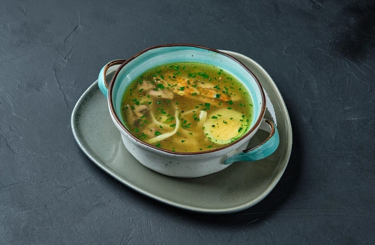 Бульон куриный, обжаренные шампиньоны, куриное филе, пшеничная лапша, зелень.