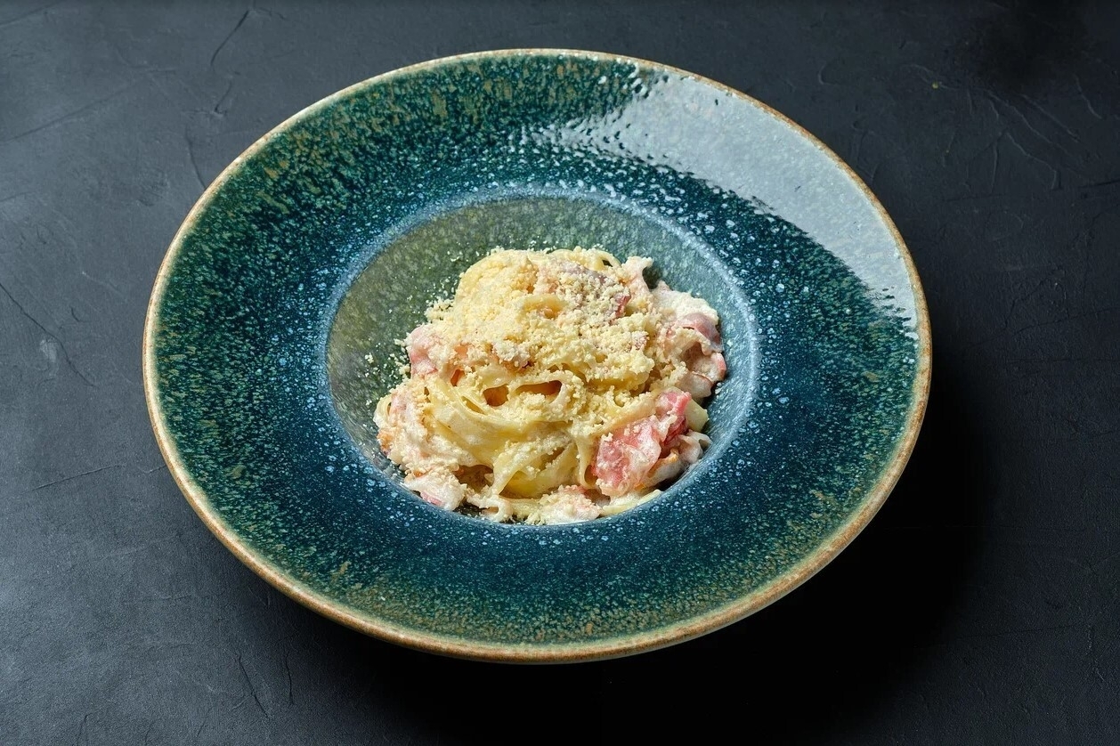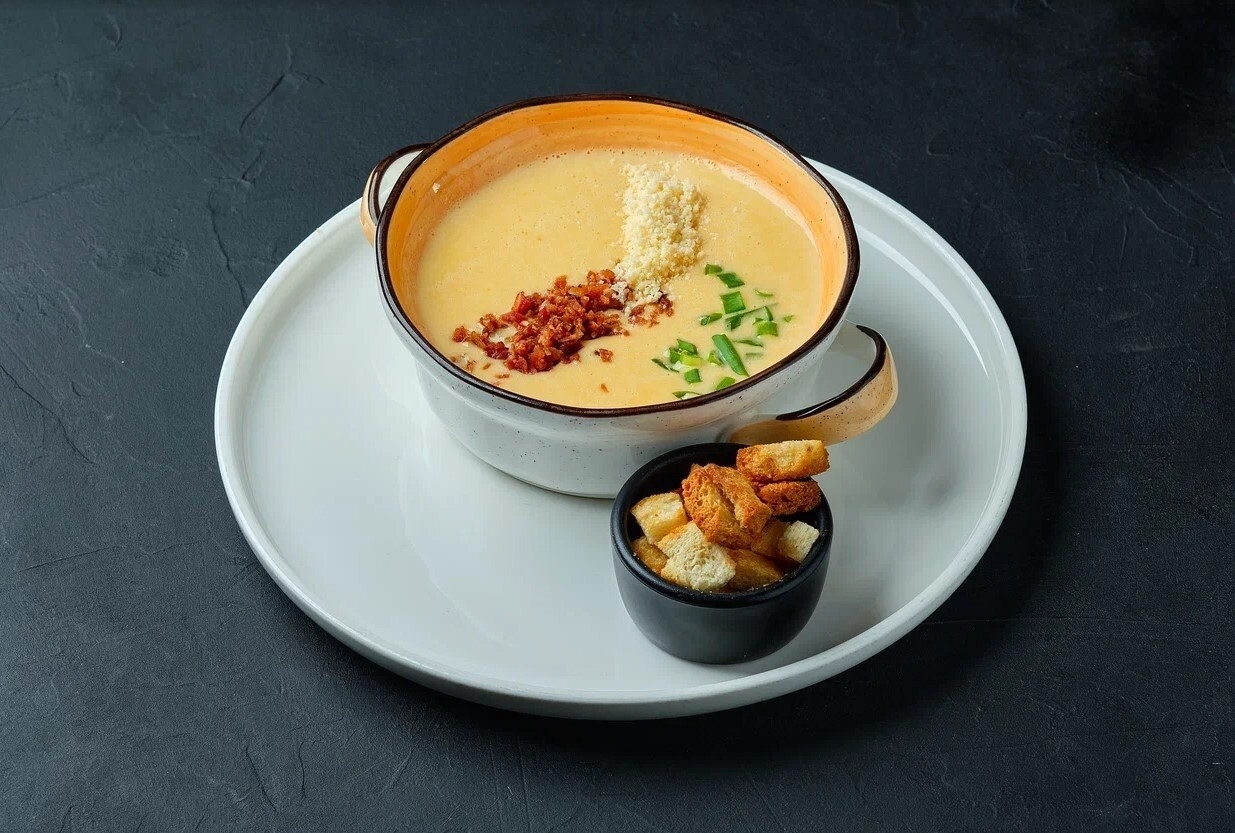 Сливочный сырный суп, обжаренный бекон, сыр Пармезан, зеленый лук.