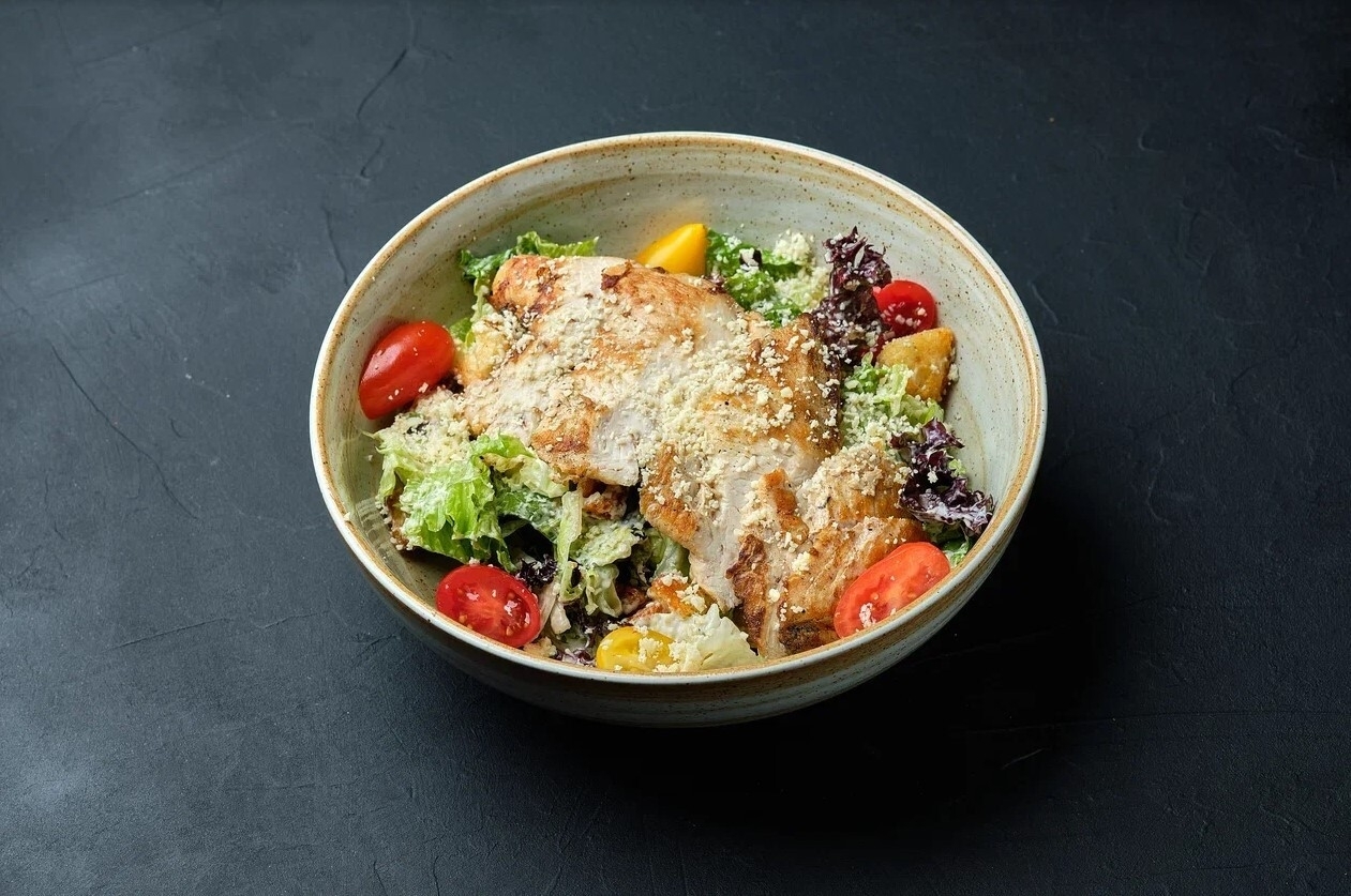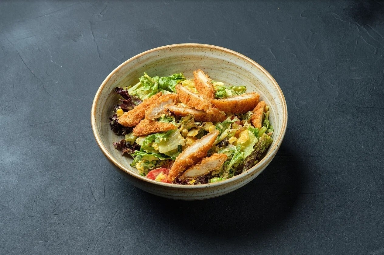 Курица фри, помидоры, кукуруза, моцарелла, микс салата, медово-горчичный соус, соломка из кукурузной лепешки.