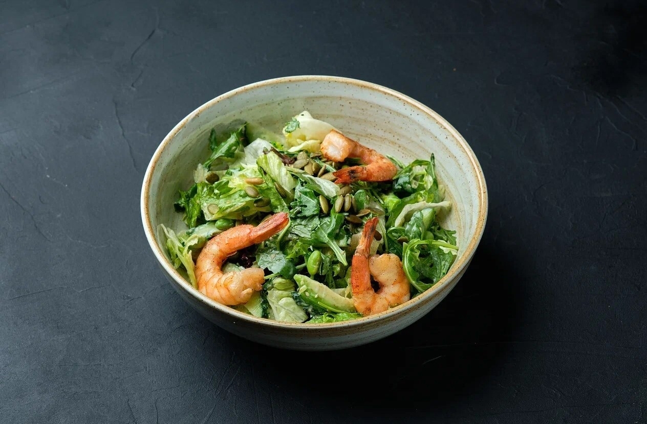 Лист салата, авокадо, руккола, бланшированная брокколи, бобы Эдамамэ, свежий огурец, кунжутный соус, тыквенные семечки, обжаренные креветки.