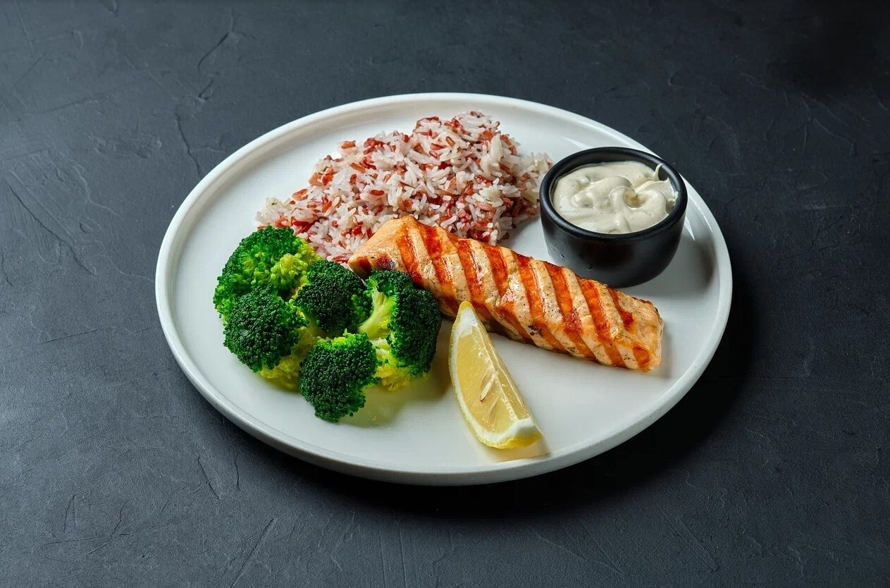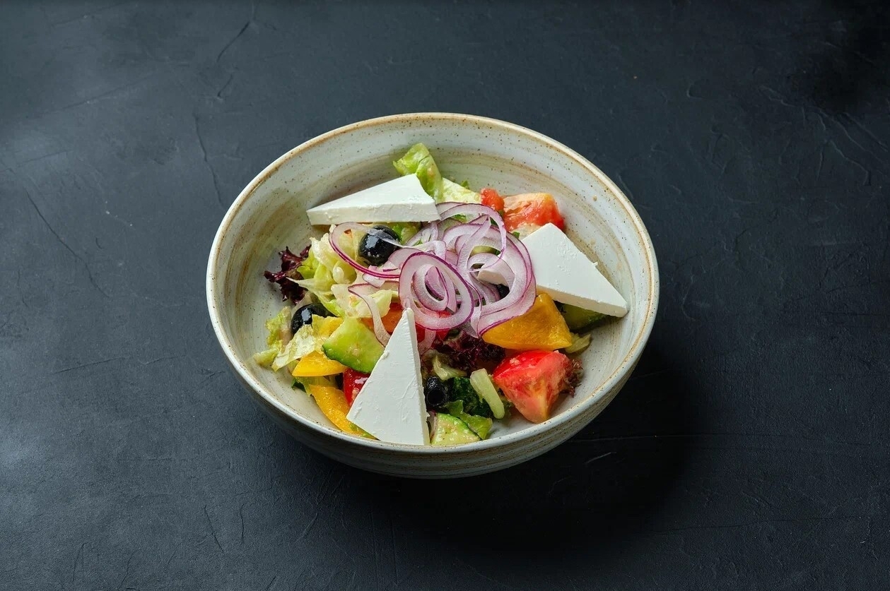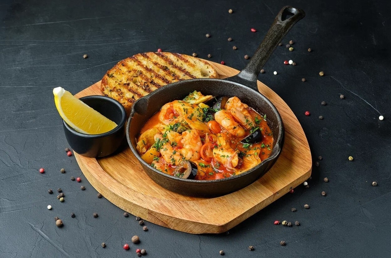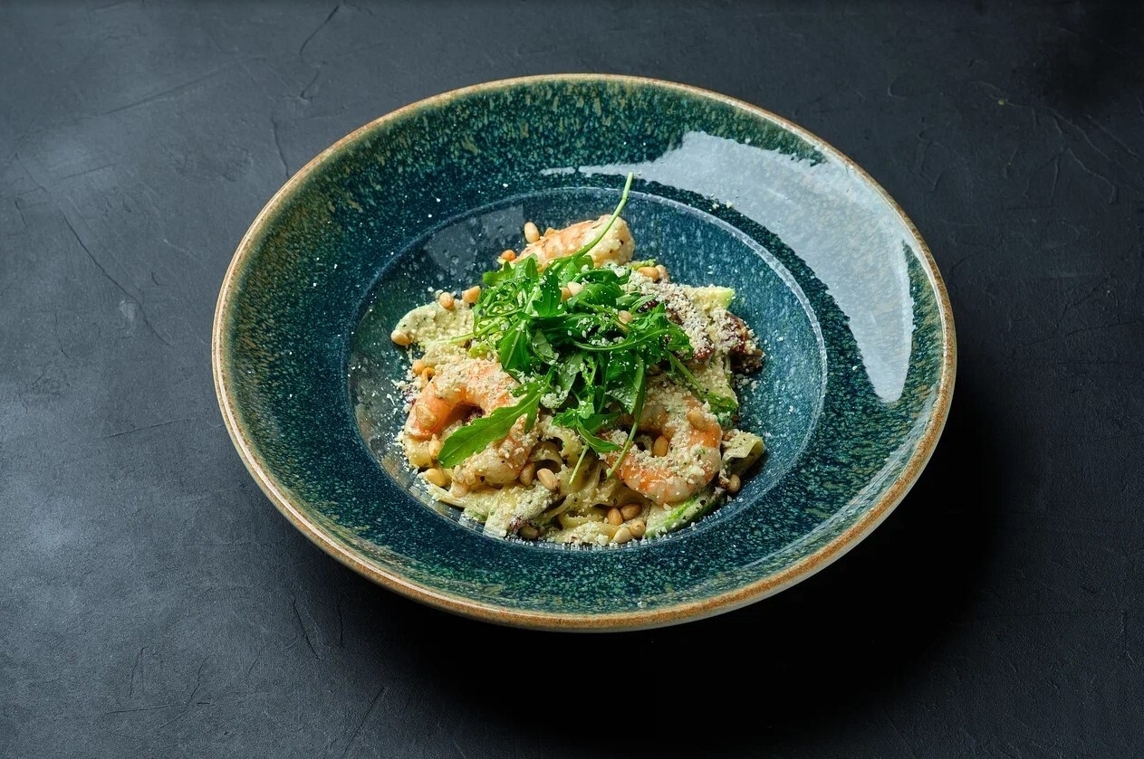 Креветки, брокколи, маслины, черри, артишок, петрушка, соус Алтынай, масло зеленое.
