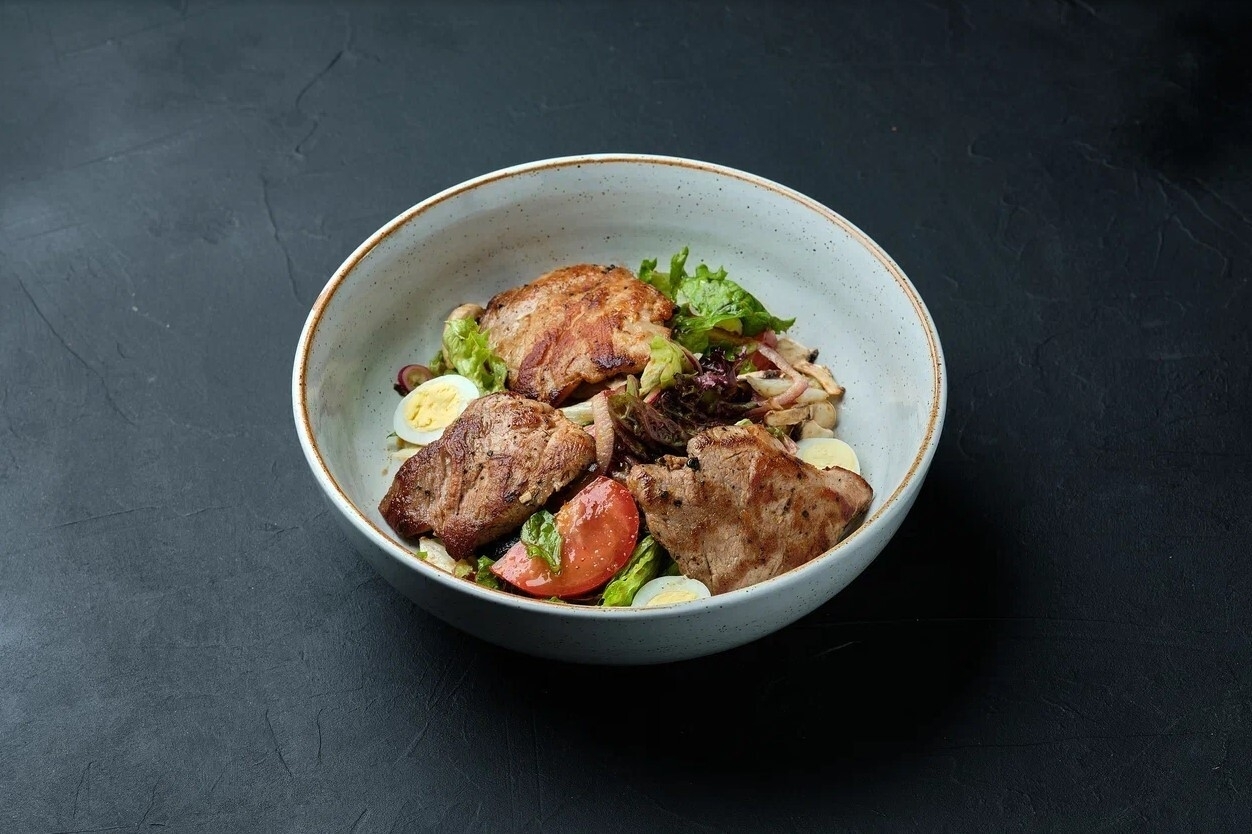 Свиная вырезка гриль, шампиньоны. перепелиные яйца, красный лук, томаты, маслины, листья салата, соус на основе меда и гранатового сока.