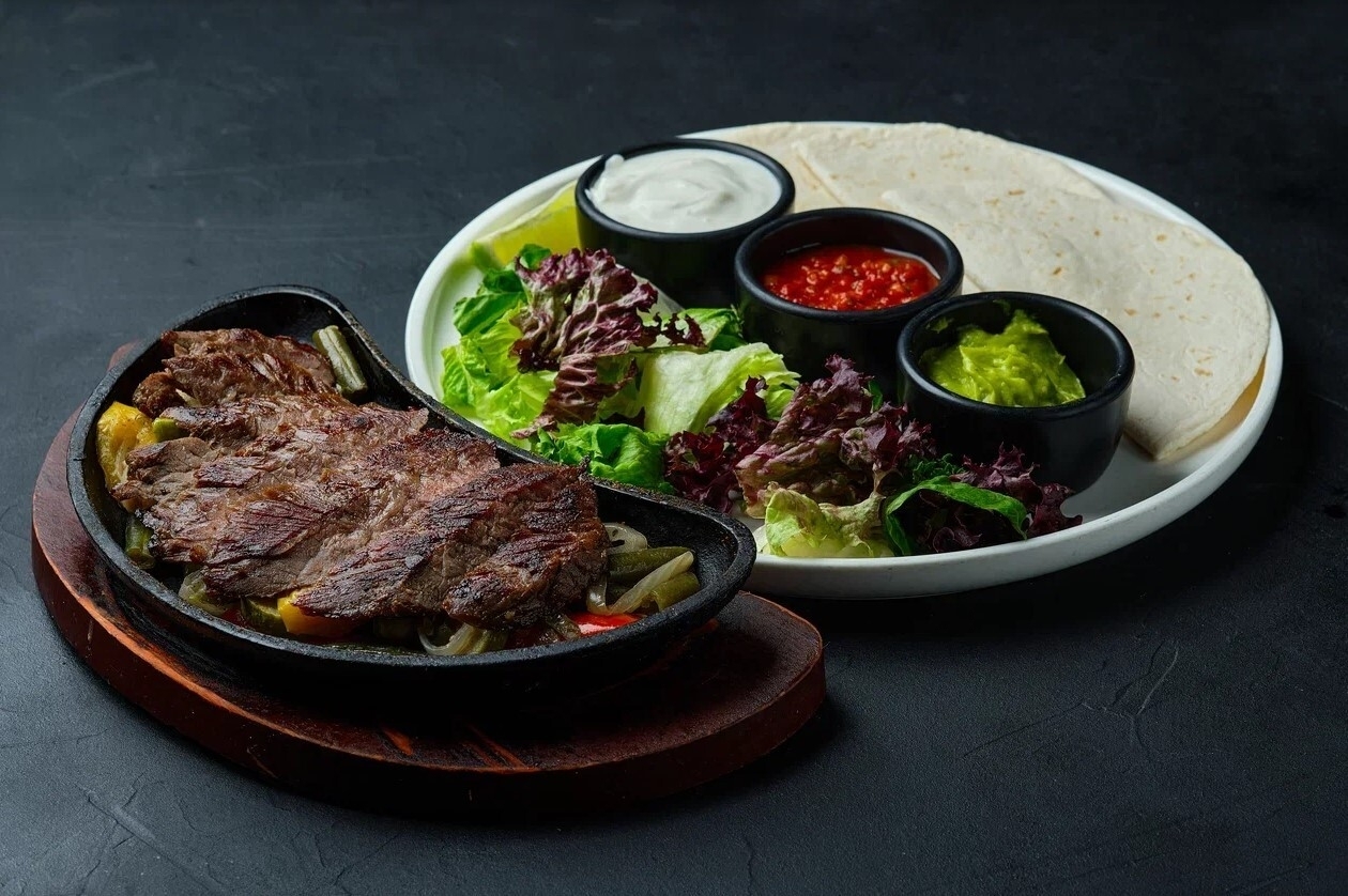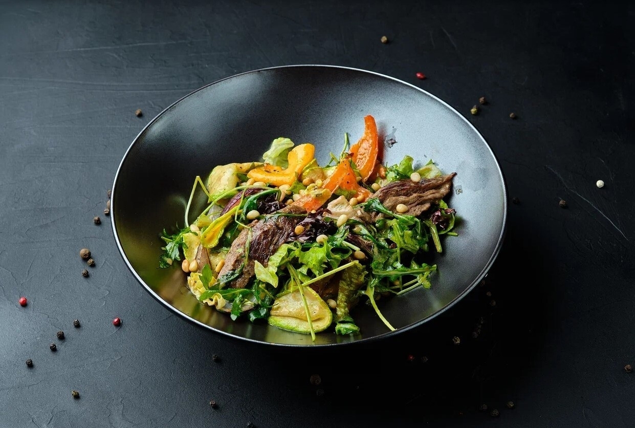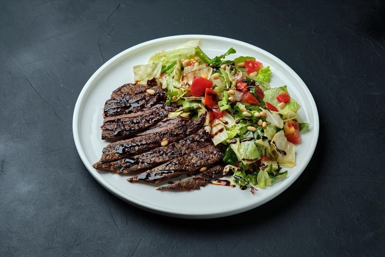 Стейк скерт, микс салатных листьев, руккола, свежие томаты, печеный перец, кедровые орешки, крем бальзамический.