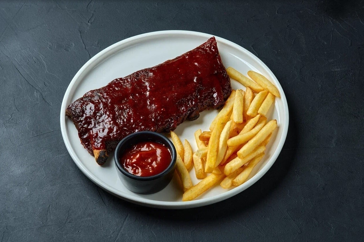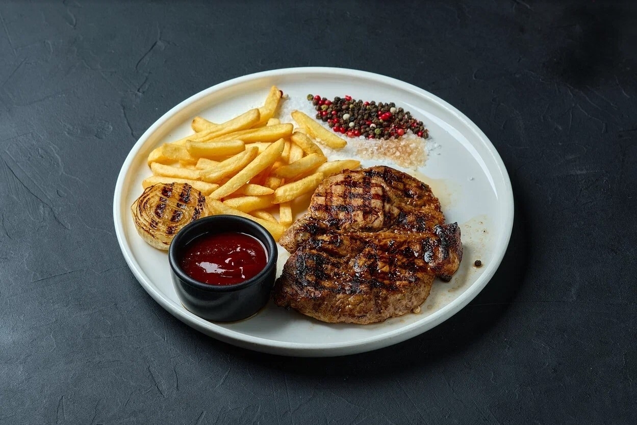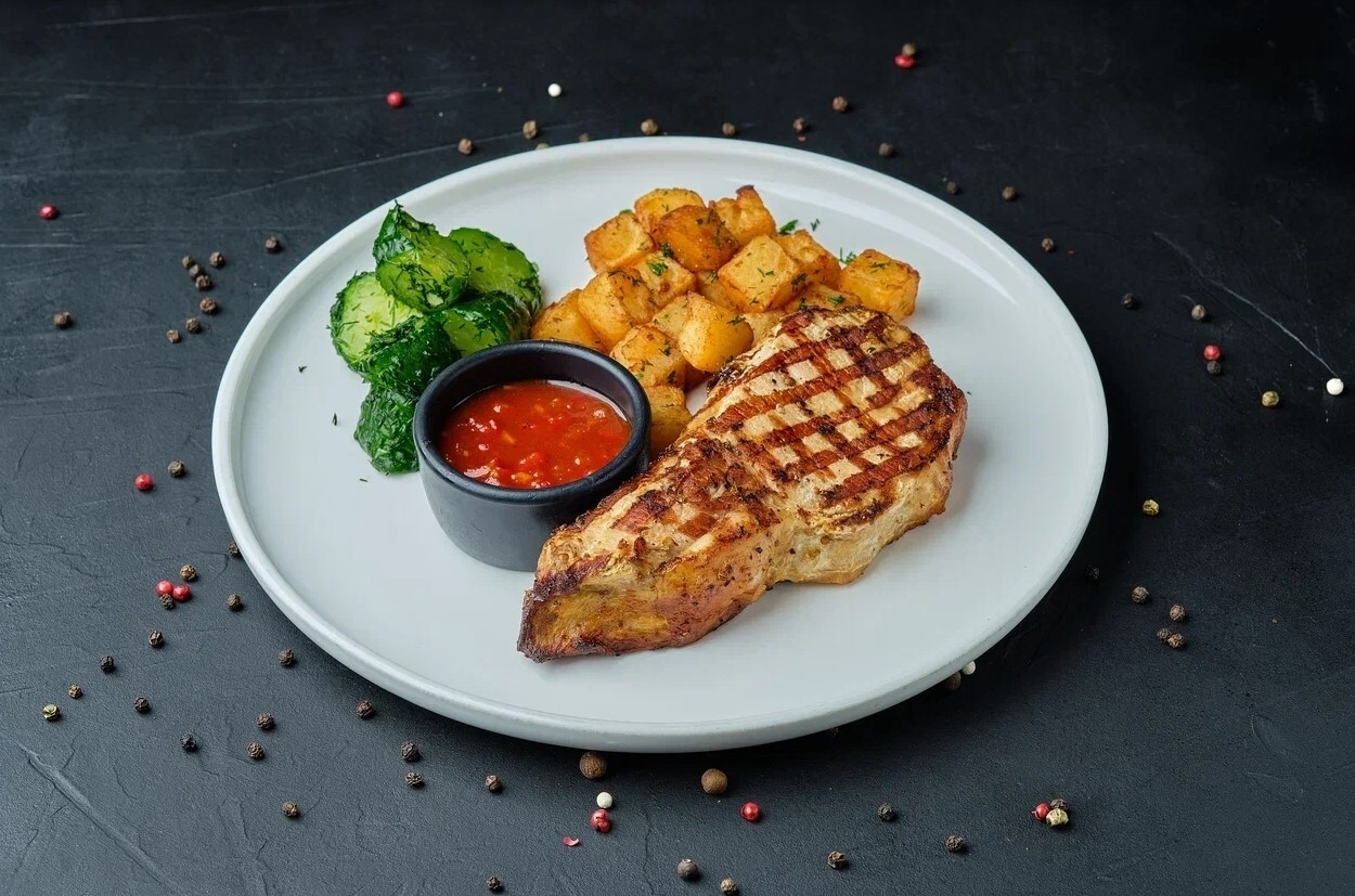 Свиная корейка, приготовленная на гриле. Подается с обжаренным картофелем, огурцы малосольные и соусом Сальса.