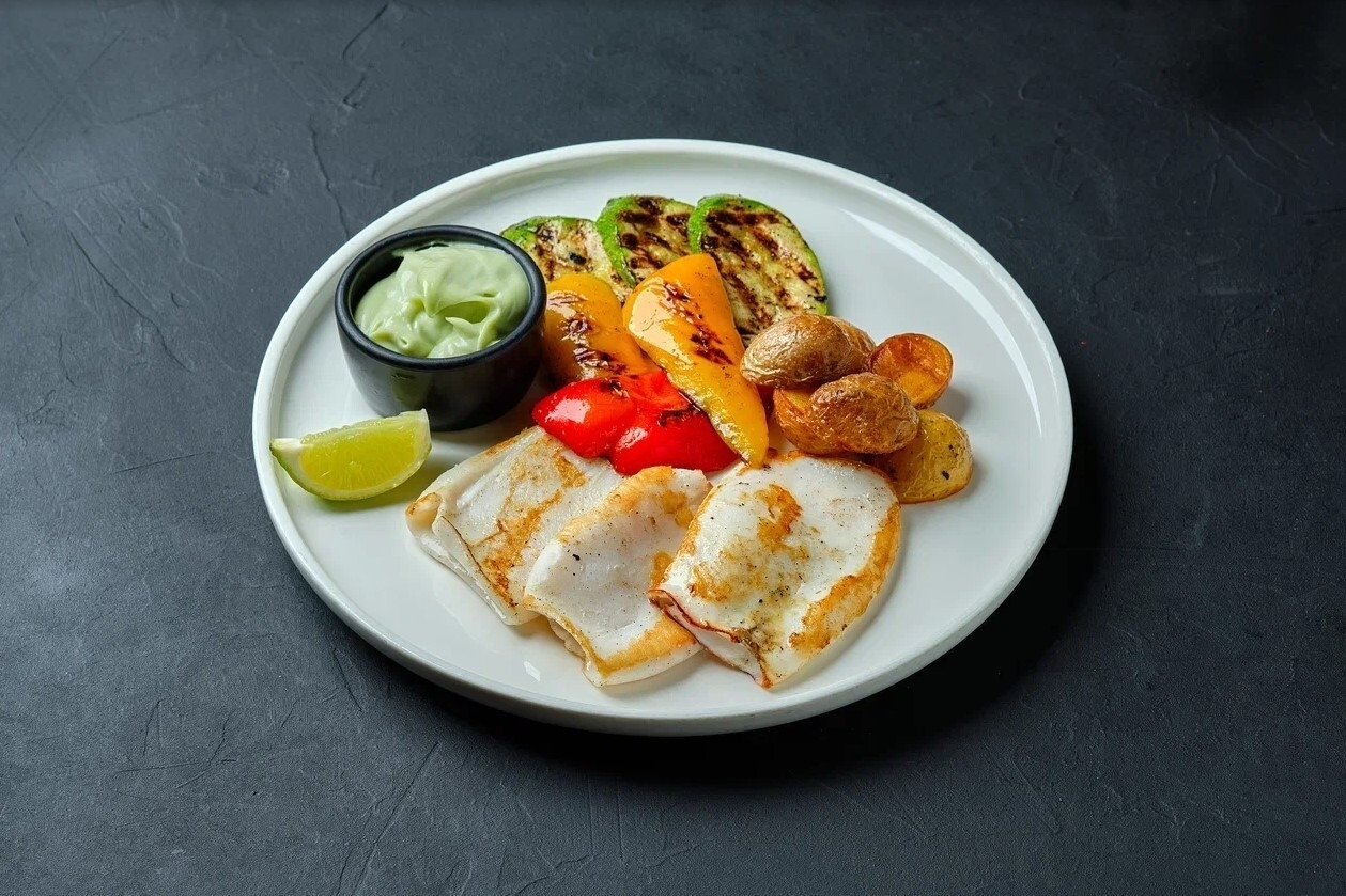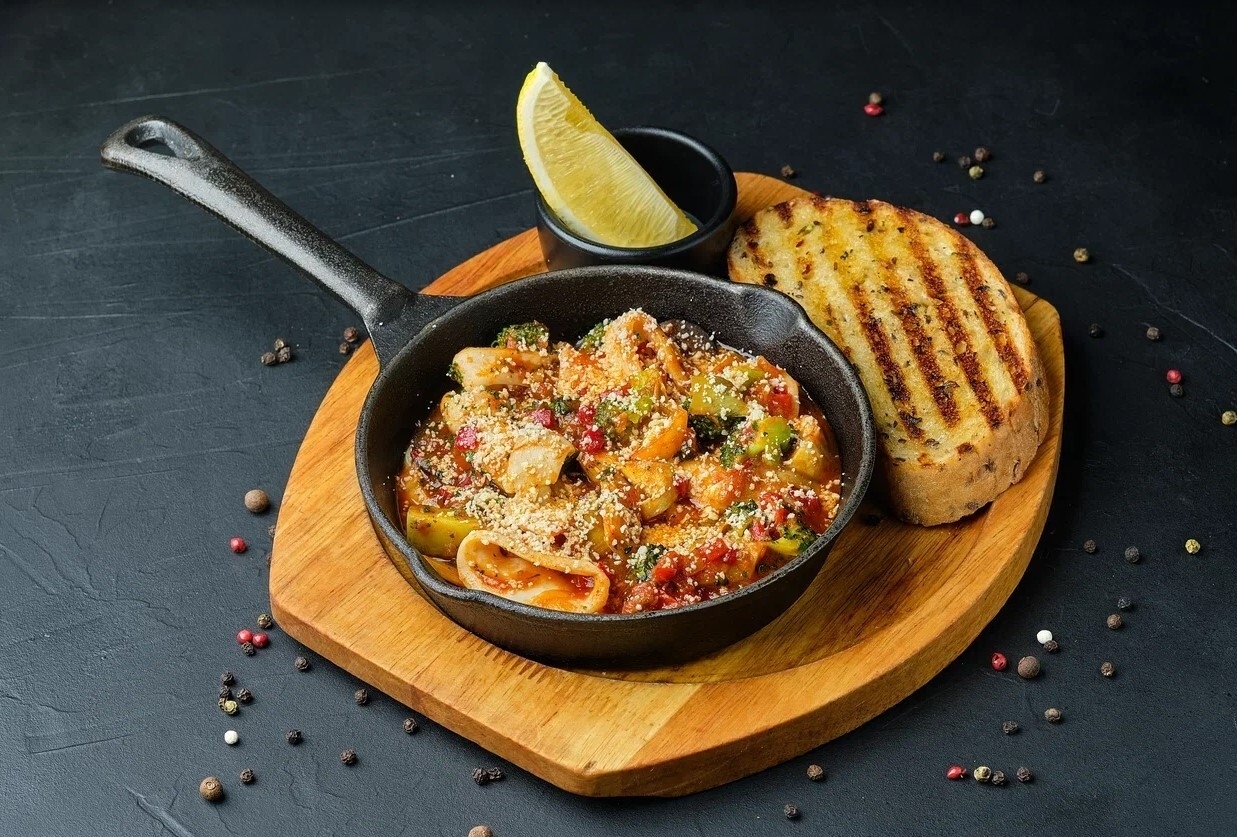 Кальмар, брокколи, черри, артишок, маслины, соус Алтынай, сыр пармезан, масло зеленое.