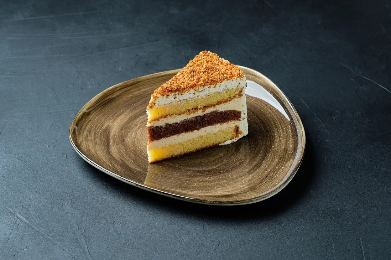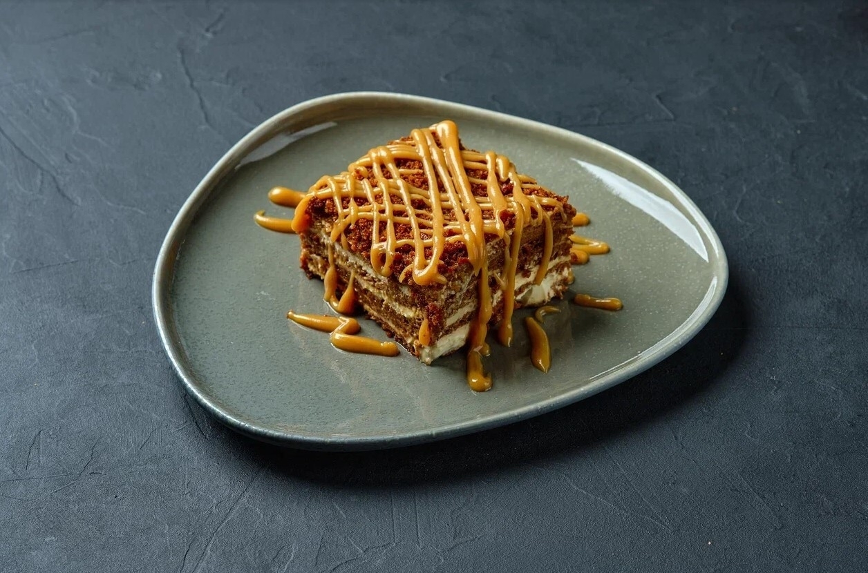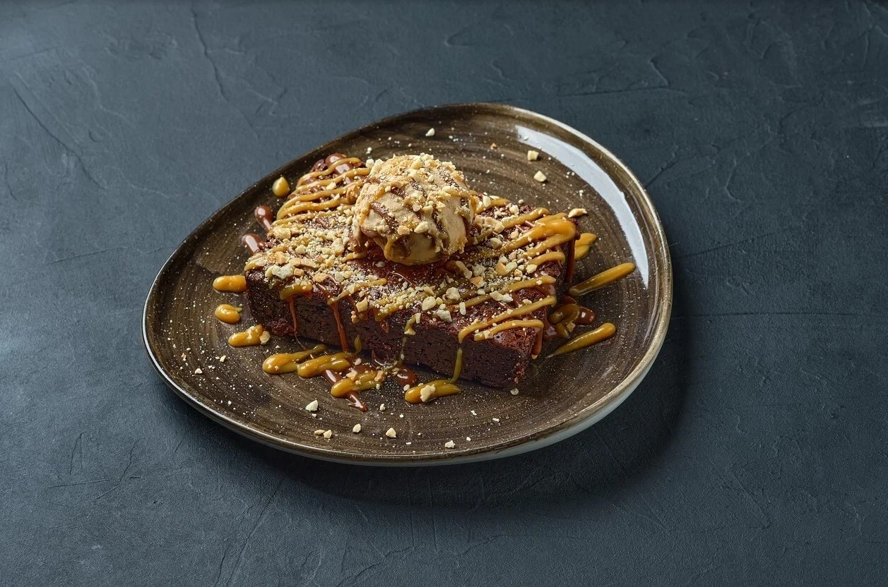 Знаменитый шоколадный бисквит. Подается с карамельным и шоколадным топпингом, орехом кешью и арахисом.