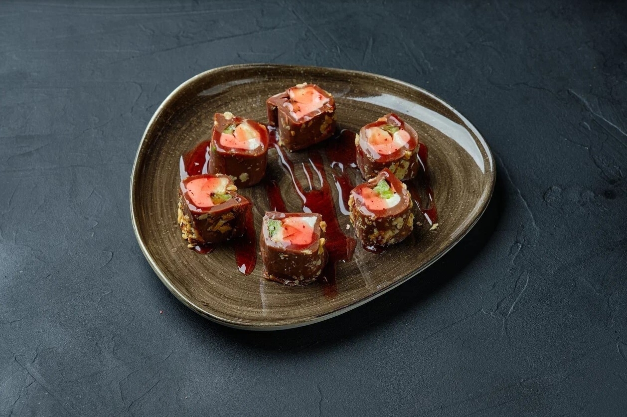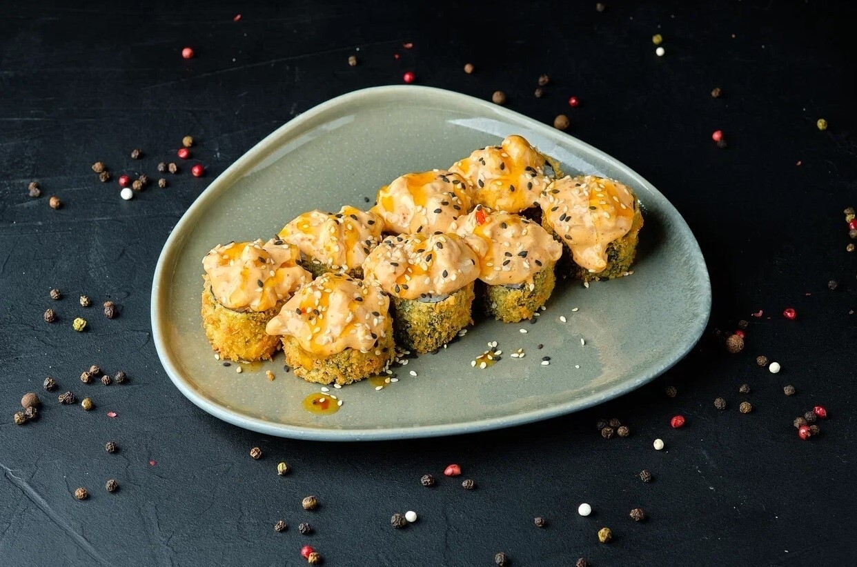 Теплый ролл с угрем, лососем и соусом спайс, обжаренный в панировочных сухарях во фритюре