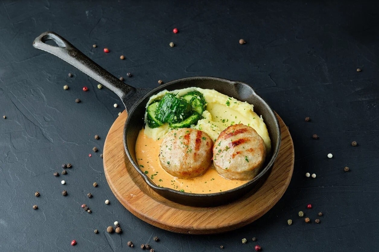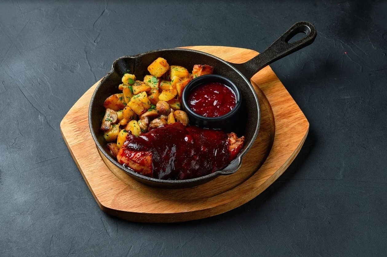 Свиная вырезка, соус хойсин, картофель, шампиньоны жареные, укроп. Подается с соусом клюквенный с джином.