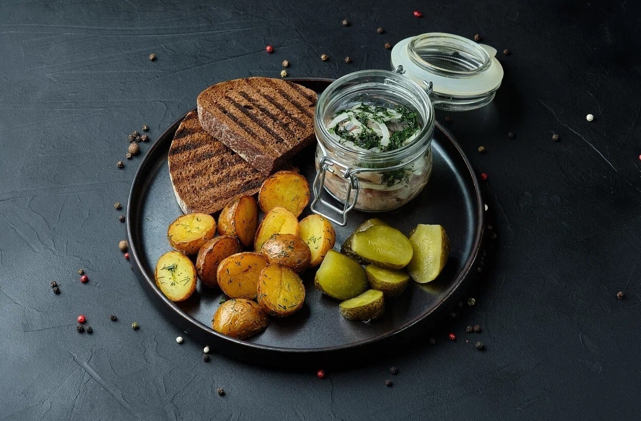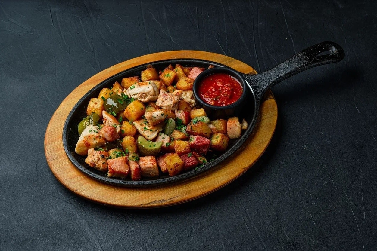 Бекон и куриное филе, обжаренные с картофелем и маринованными огурцами. Подается с соусом сальса и свежей зеленью.