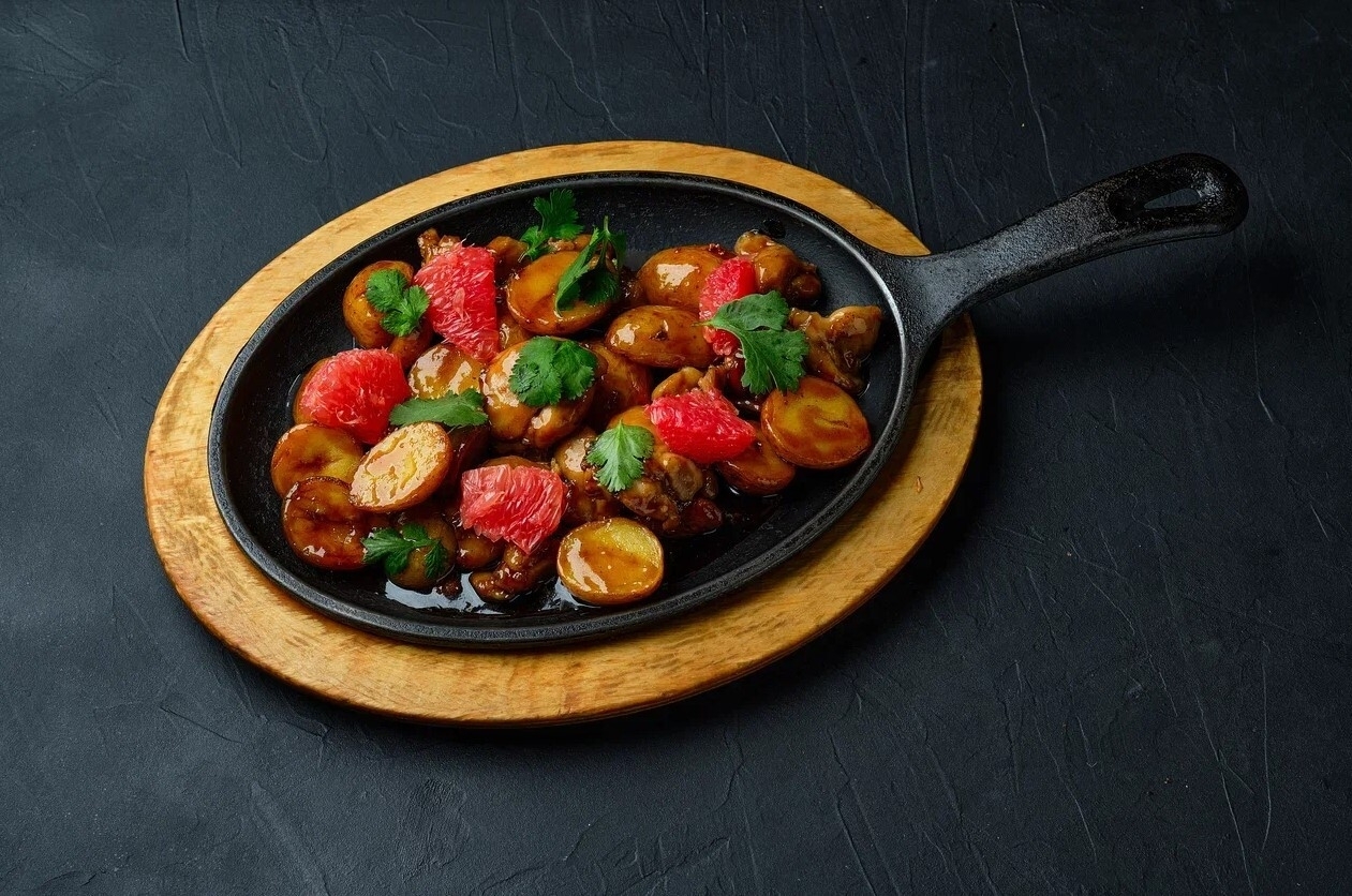 Куриное бедро, обжаренное в соусе чили-карамель с молодым картофелем, кинзой и мякотью грейпфрута.