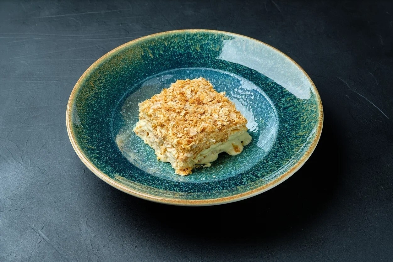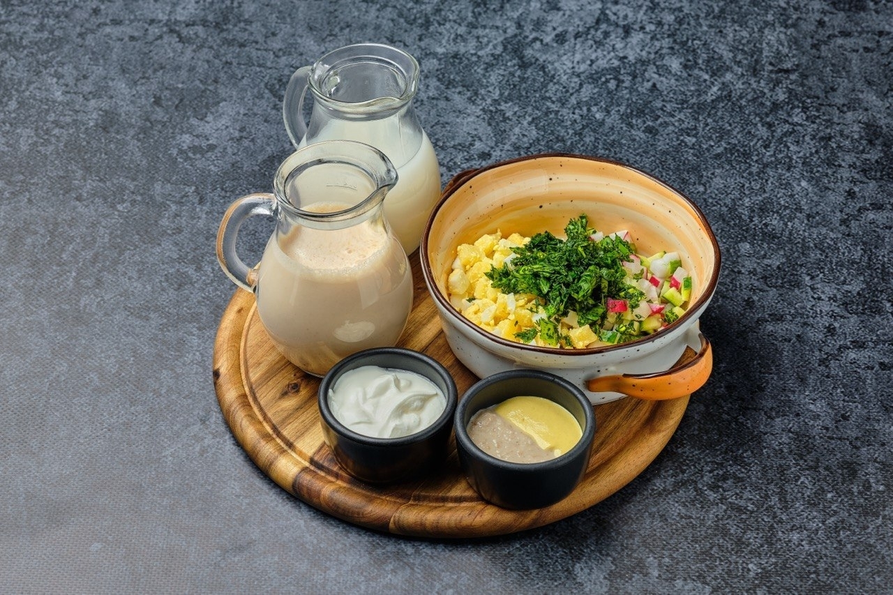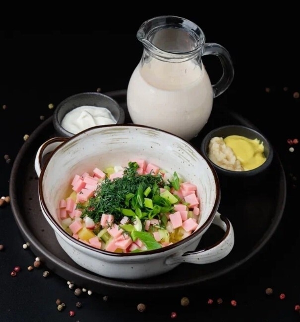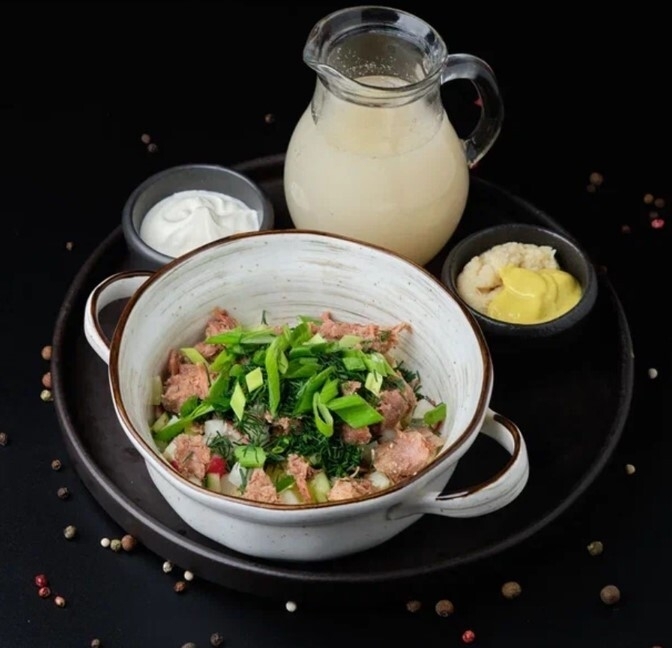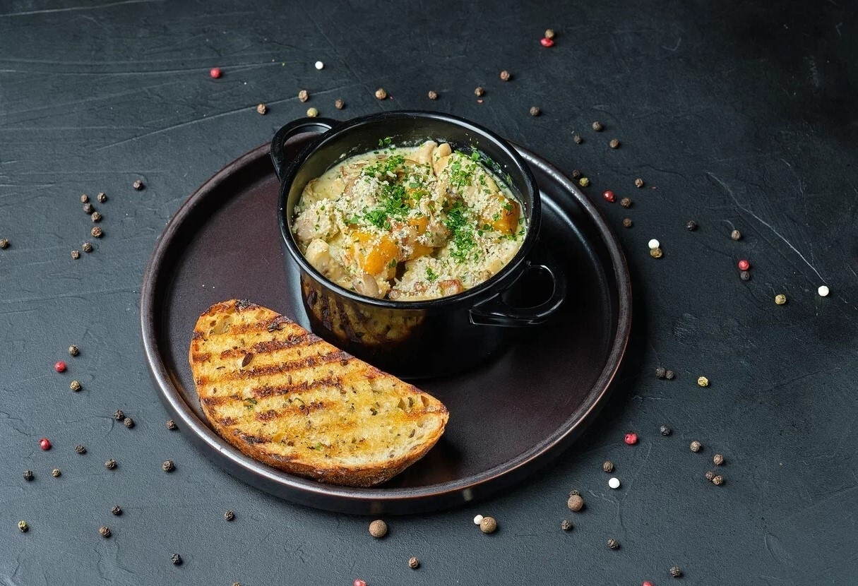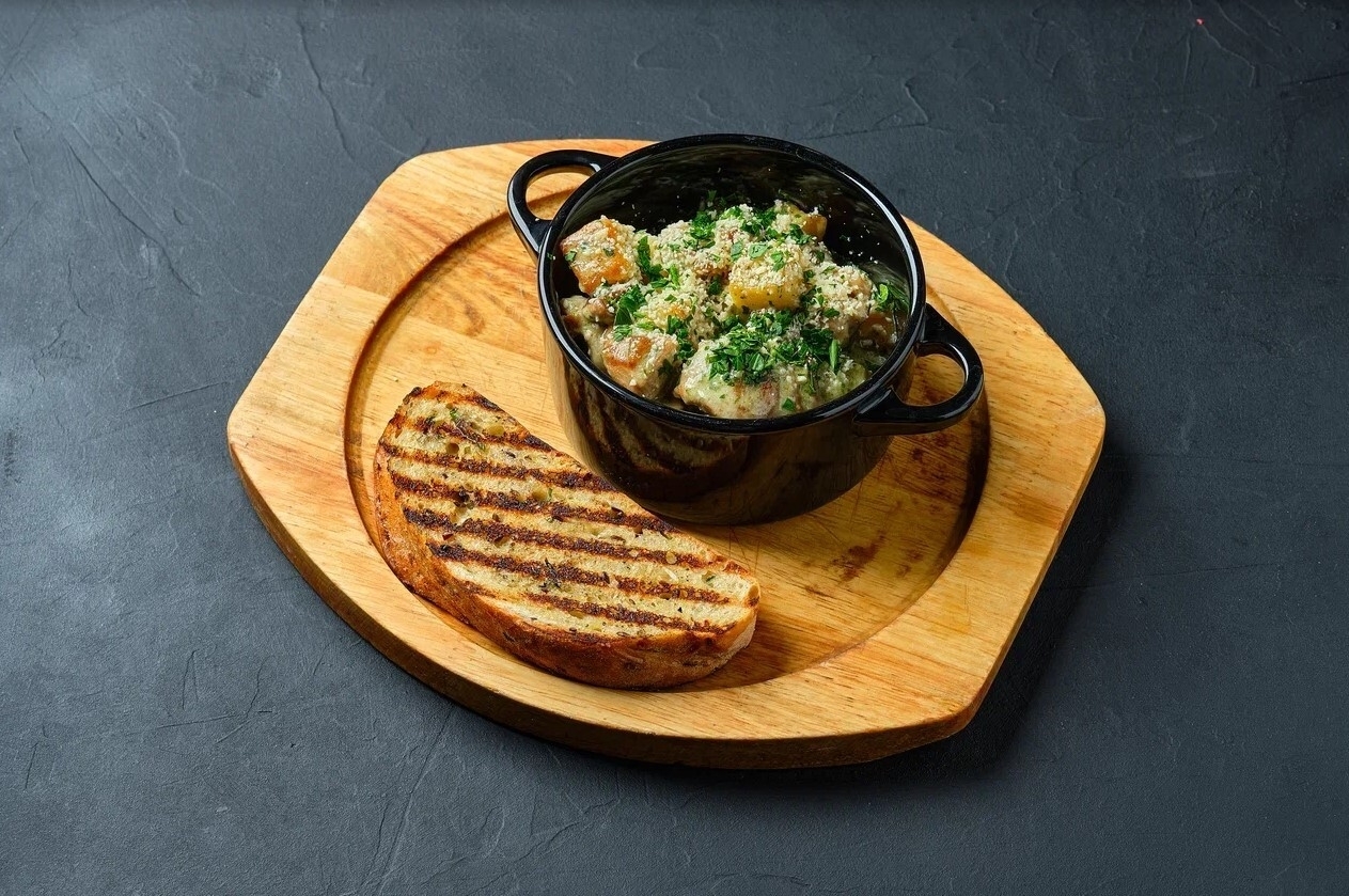 Куриное филе, свинина, говядина, обжаренные с грибами, картофелем и сливками, с добавлением зернистой горчицы и свежей зелени.