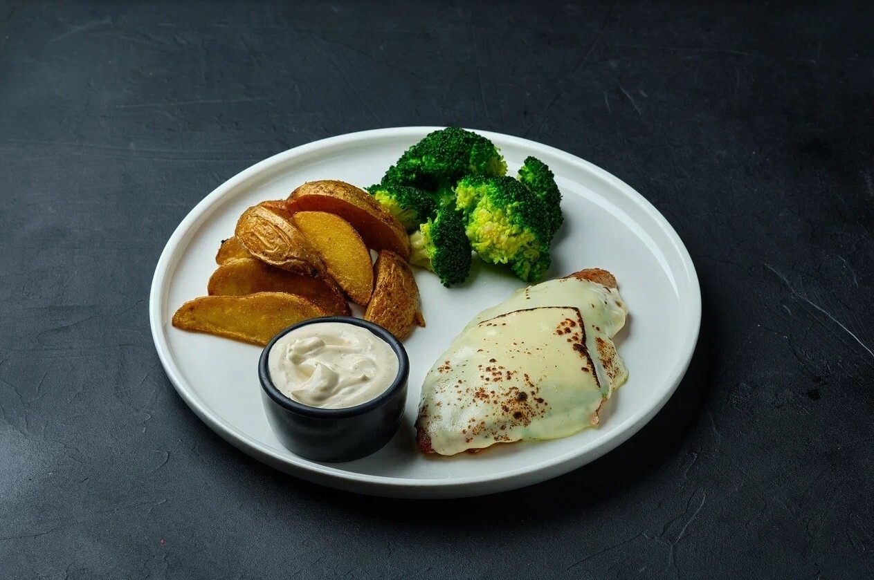 Индейка филе су-вид, шампиньоны, вешенки, соус для сковородки, картофель, петрушка рубленная, пармезан тертый, масло зеленое.