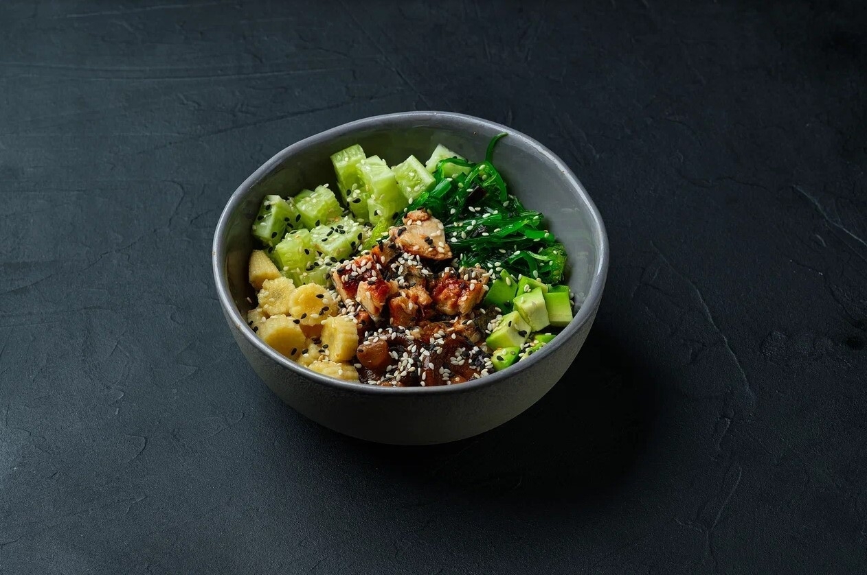 Рис, копченый угорь, огурец, авокадо, чука, грибы шиитаки, кукурузные початки, соус ореховый кимчи, кунжут.
