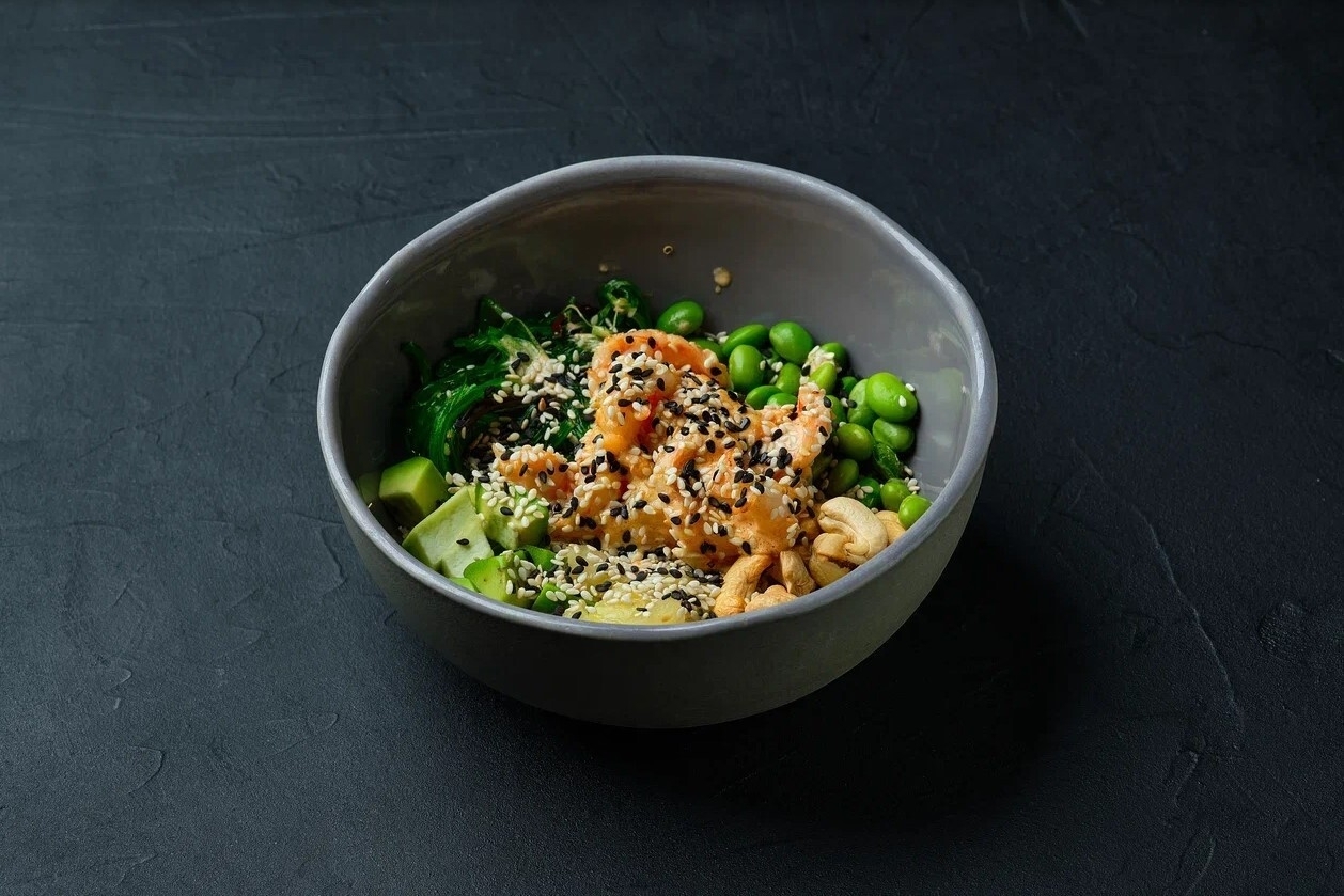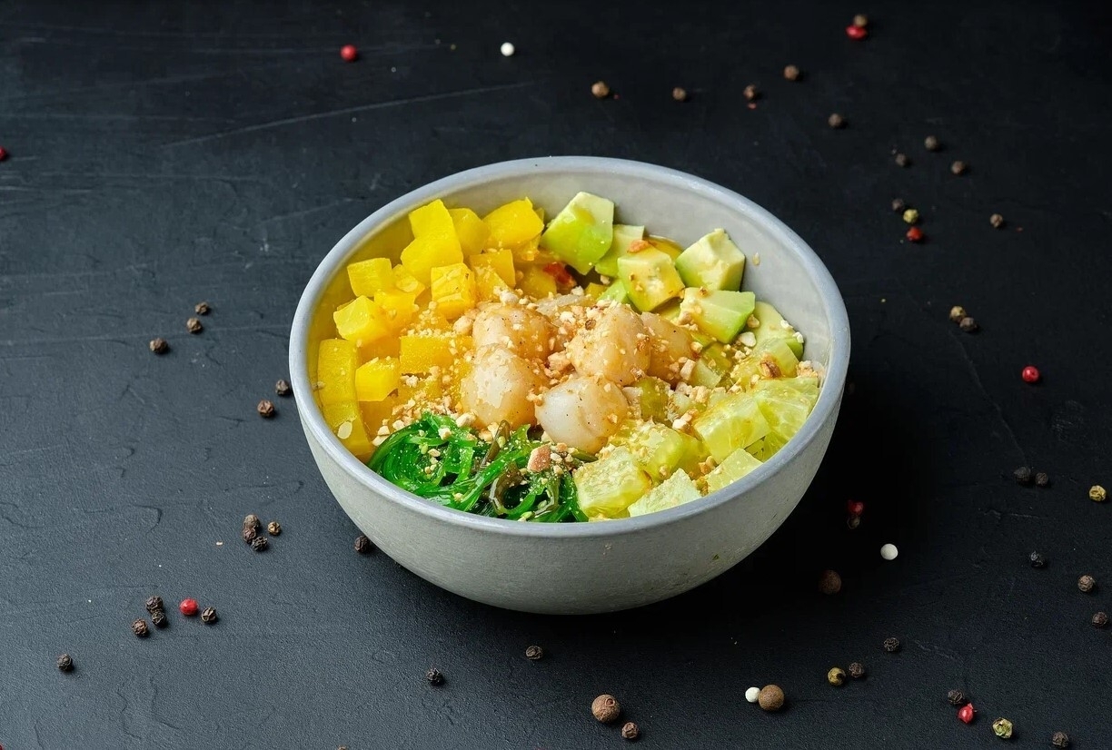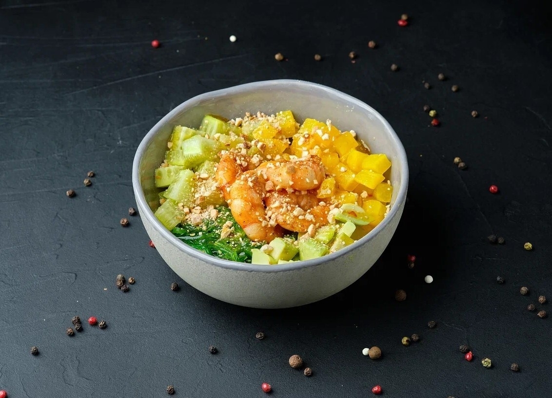Креветки, киноа, бобы эдамамэ, авокадо, чука, ананас, кешью, паста том ям, кунжут.