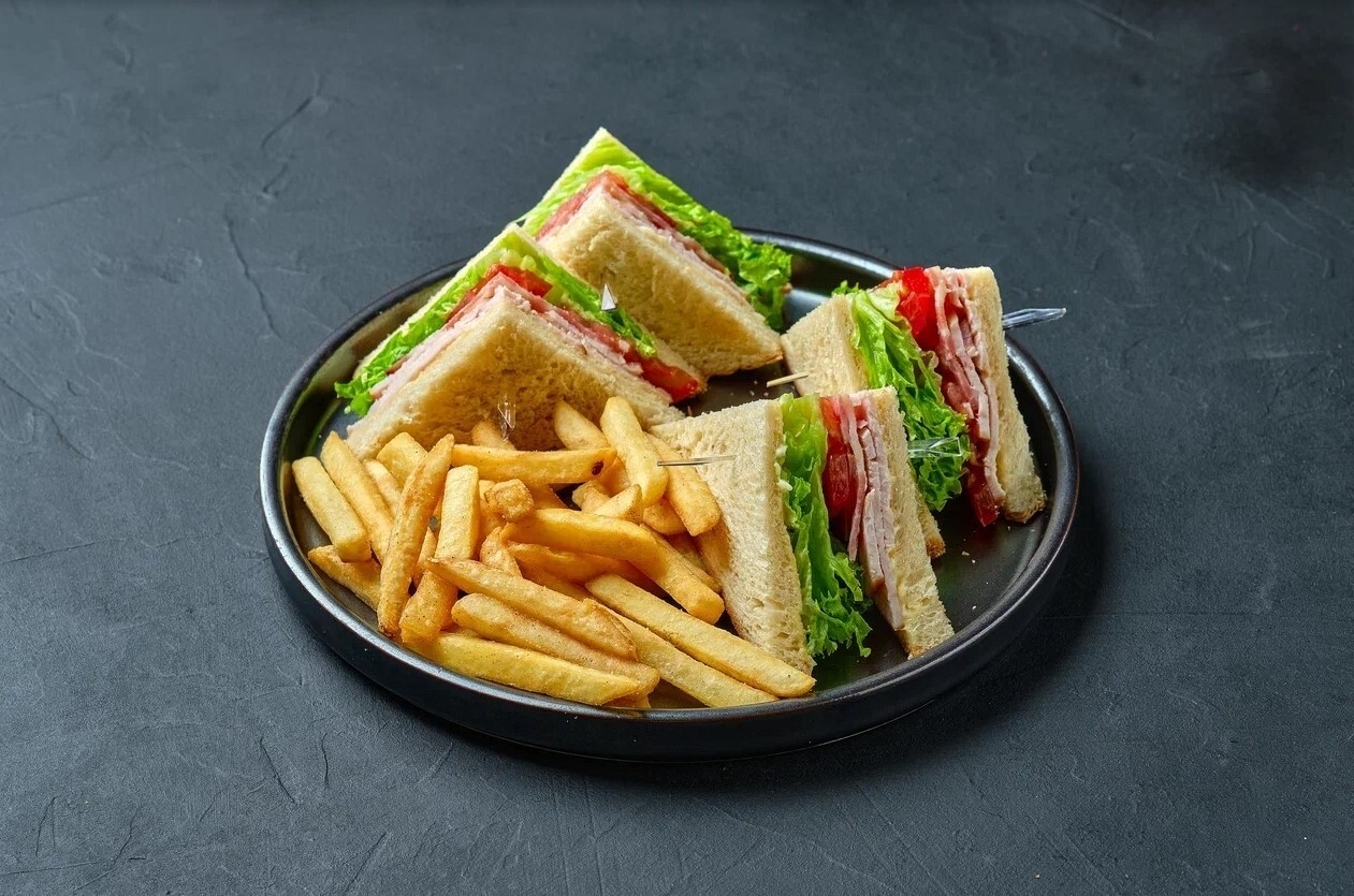 Обжаренные тосты с индейкой и беконом, свежими томатами и листом салата. Подается с картофелем фри.