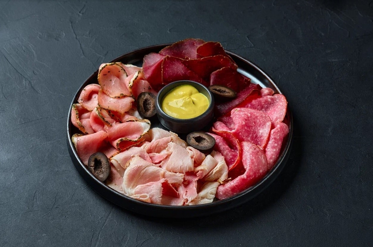 Варено-копченая свиная шейка, вырезка сыровяленой говядины, колбаса Чоризо. Подается с горчицей.