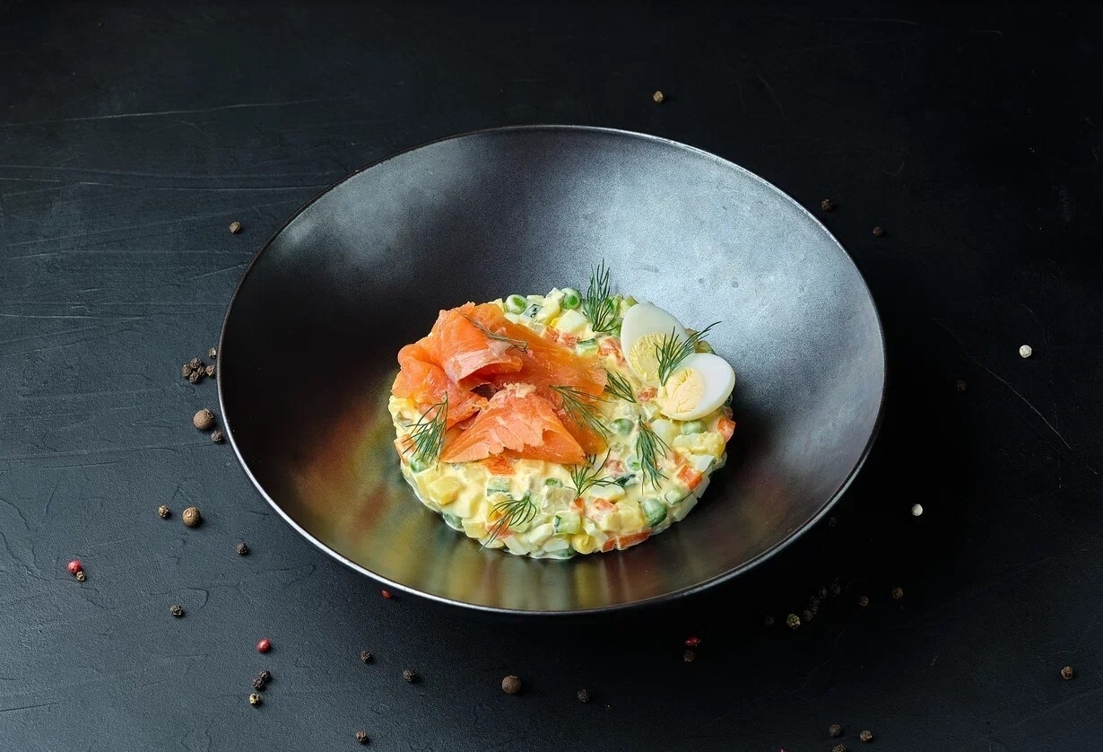 Картофель отварной, морковь отварная, огурец свежий, горошек, яйцо куриное, семга х/к, огурец бочковой, яйцо перепелиное. Подается с веточкой укропа.