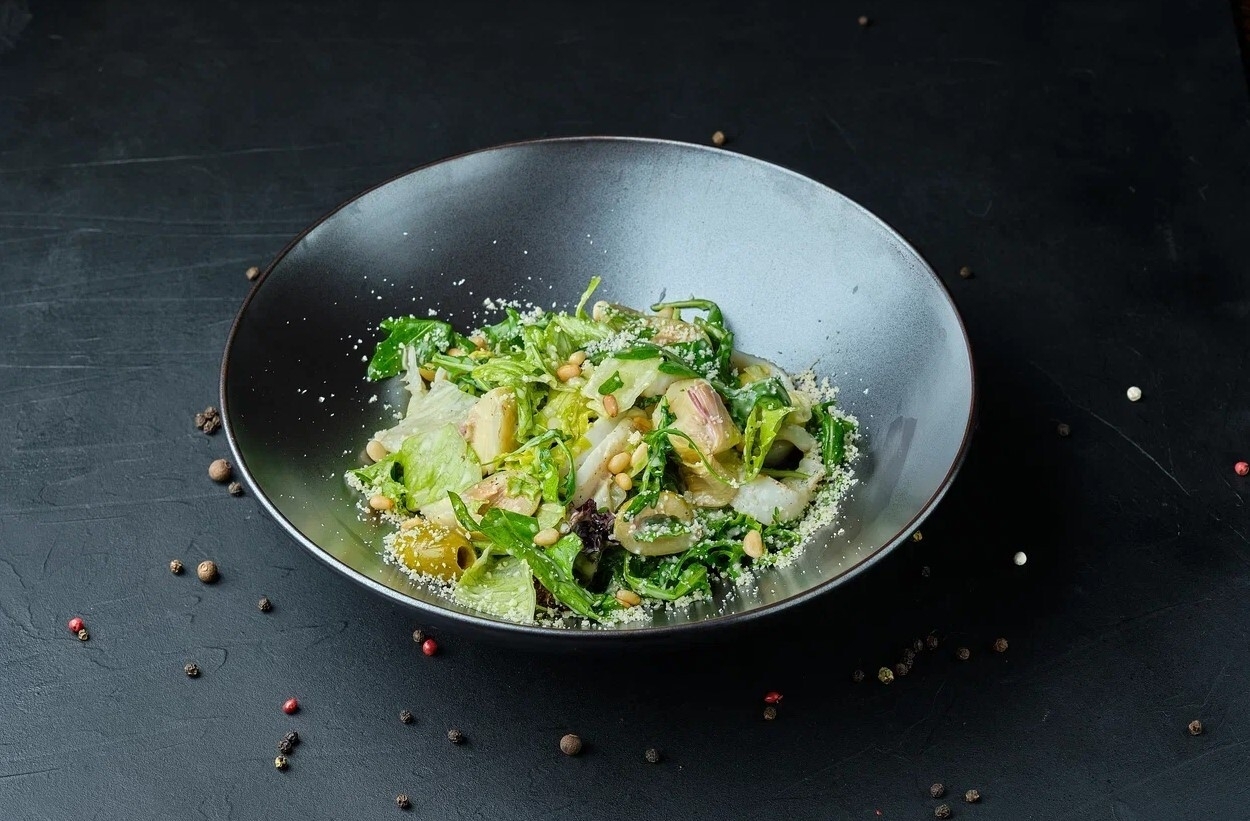 Микс салата, артишок, кальмар, масло растительное, оливки, сыр пармезан, орех кедровый