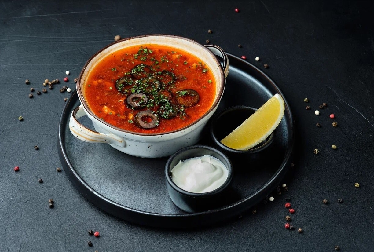 Овощной пряный суп с говядиной. Подается с зеленью, сметаной и домашним хлебом.
