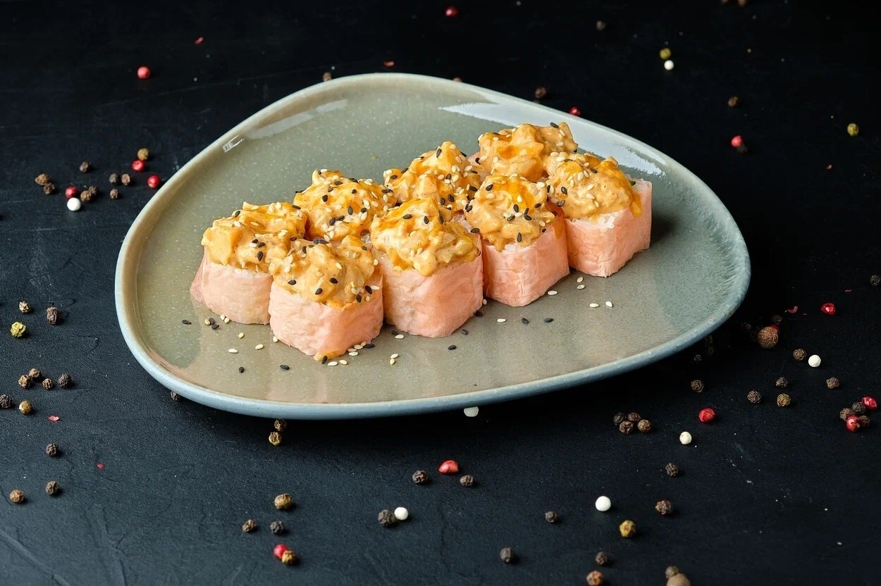 Теплый ролл с лососем, сливочным сыром, крабом (имитация), соусом спайси