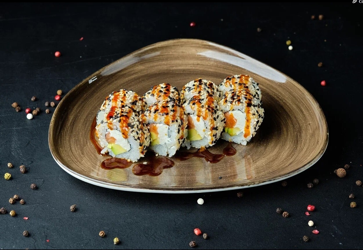 Ролл с копченым угрем, нежным лососем, авокадо, японским майонезом, кунжутом и соусом терияки