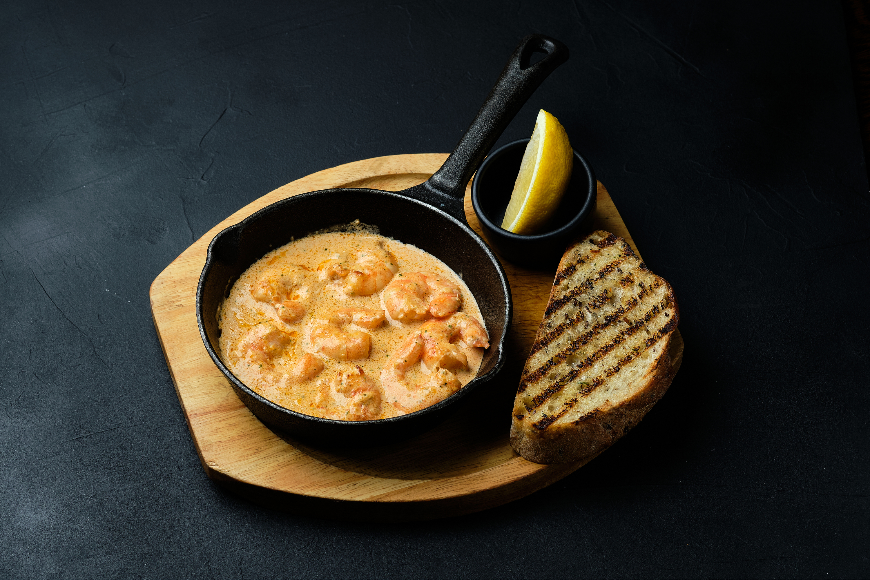 Сливочный суп с отварными тигровыми креветками, красной рыбой, кукурузой и картофелем.