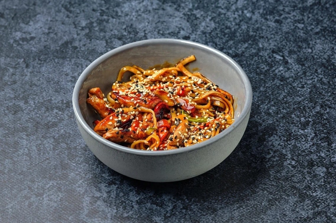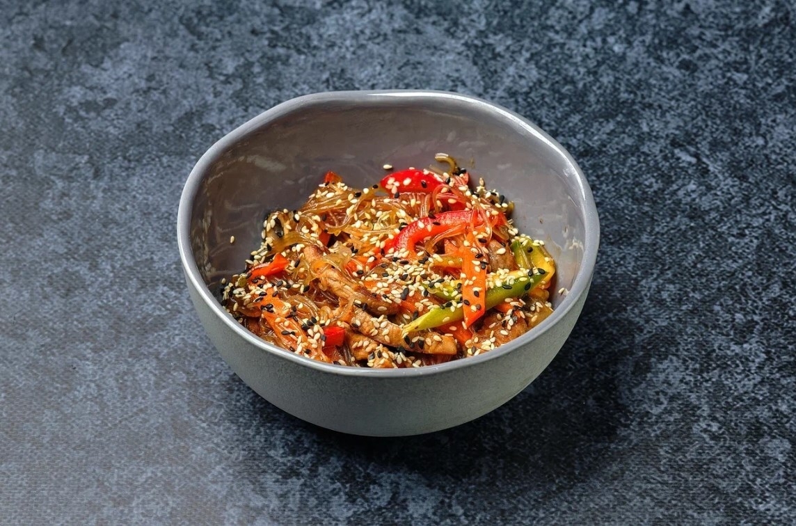 Рис, тунец, черри, чука, огурец, авокадо, лист салата, соусы ореховый кимчи и сладкий чили, кунжут.