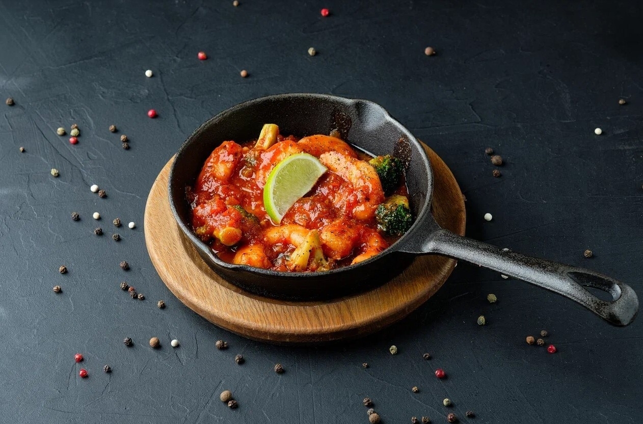 Креветки тигровые, томатный соус, брокколи. Подаются с лаймом.