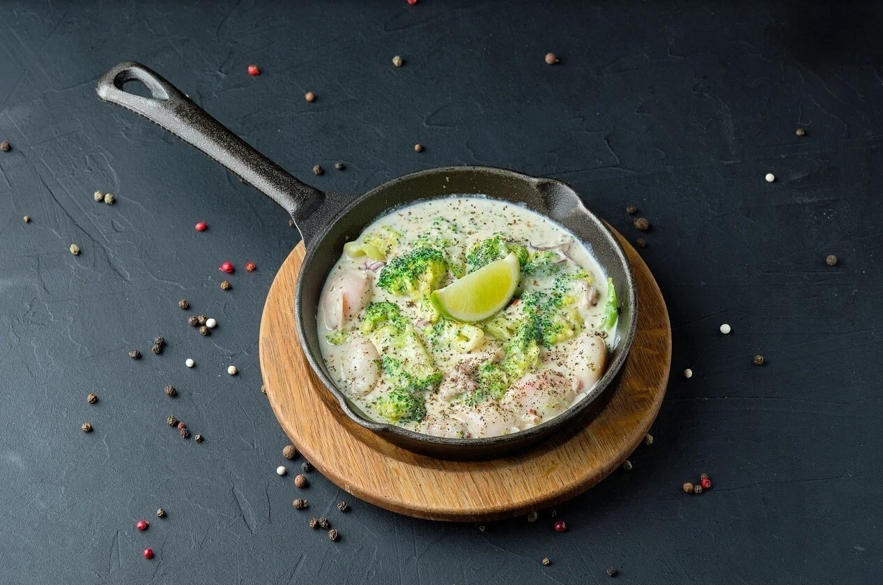 Мини-кальмары, специи, брокколи, соус Альфредо. Подаются с зеленью и лаймом.