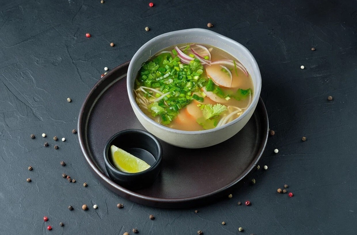 Пряный азитский суп с курицей, лапшой и специями. Подается с зеленью и лаймом.