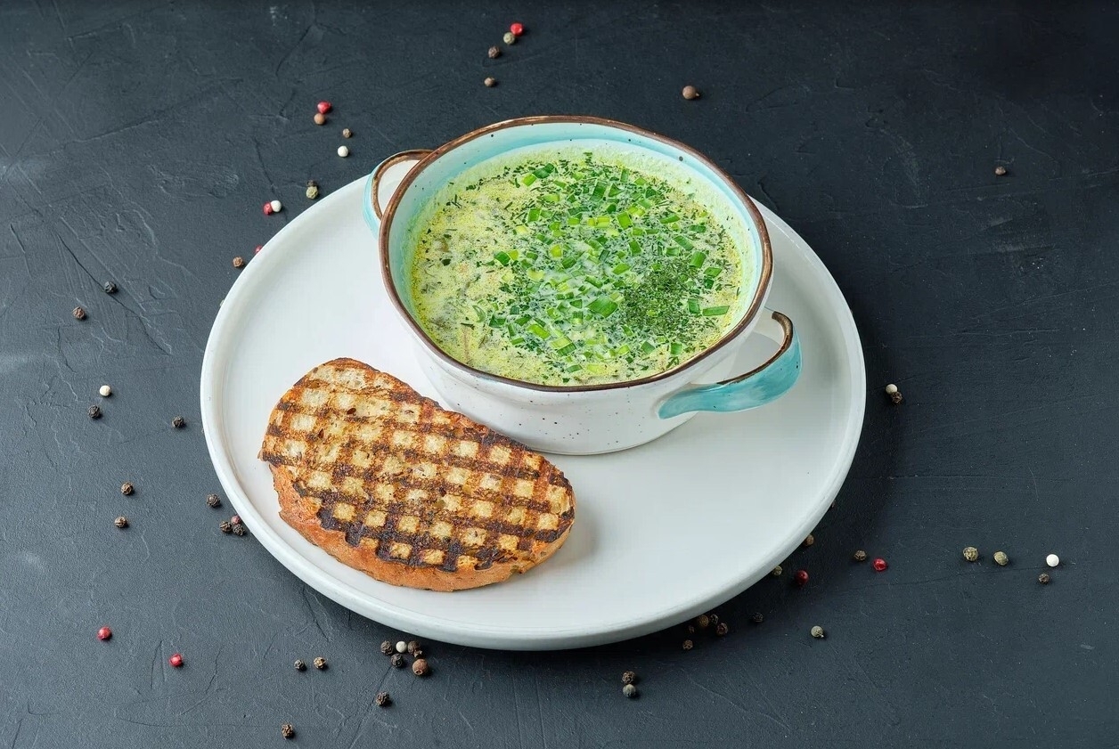 С добавлением сливок и зелени. Подается с поджаренным деревенским хлебом.