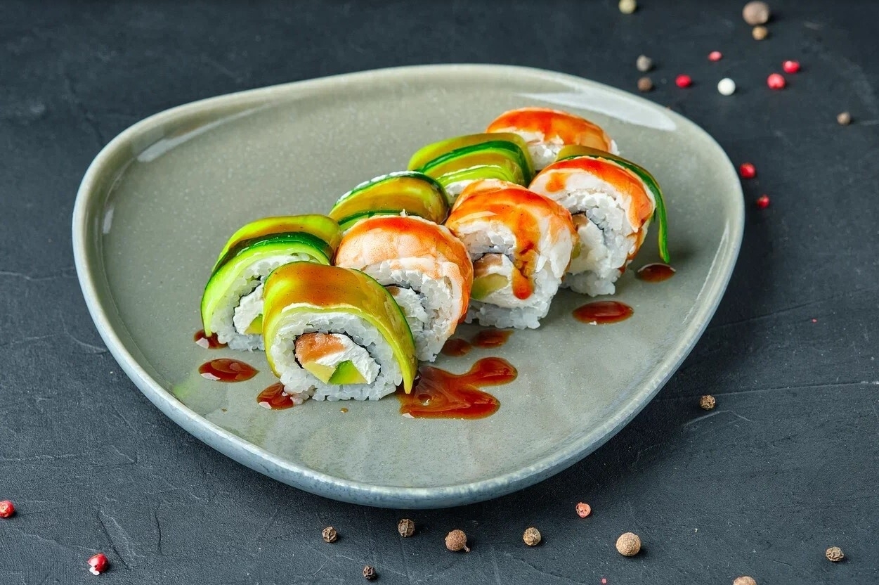 Тигровая креветка, имитация краба, сливочный сыр, огурец, соус спайси