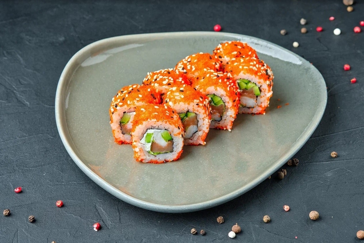 Роллы с крабом (имитация), авокадо, огурцом, икрой летучей рыбы, японским майонезом