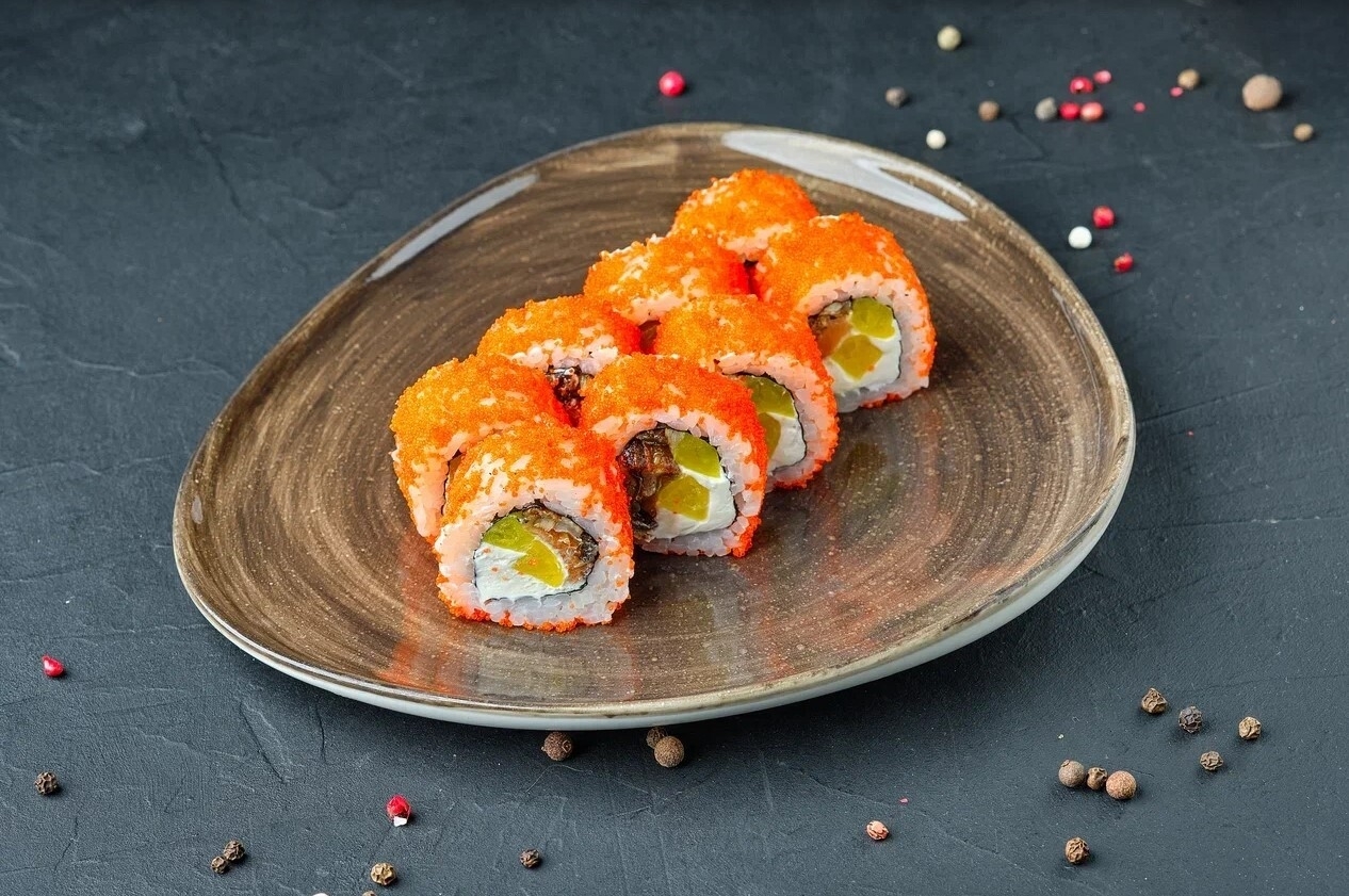 Рис, нори, сливочный сыр, лосось, угорь, маринованный дайкон, Тобико