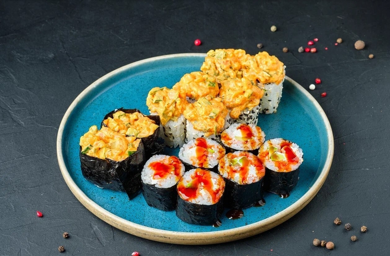 Ролл с семгой, авокадо, сливочным сыром, икрой Тобико и соусом Унаги, ролл с семгой, авокадо, сливочным сыром, огурцом и соусом Спайси, гунканы с семгой, огурцом и соусом Спайси.