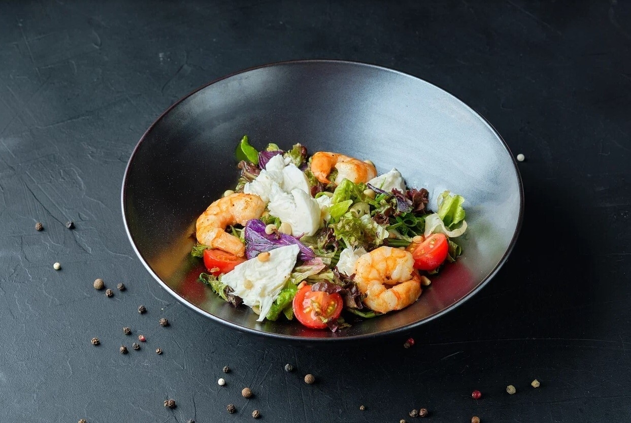 Микс зелени, креветки тигровые, Моцарелла, черри, ореховый микс, заправка фирменная